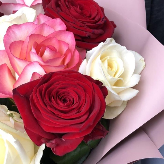 Лента атласная – 1 шт.Пленка матовая – 1 шт.розы сорта red naomi – 3 шт.роза сорта аваланж – 3 шт.роза сорта джумилия – 3 шт.