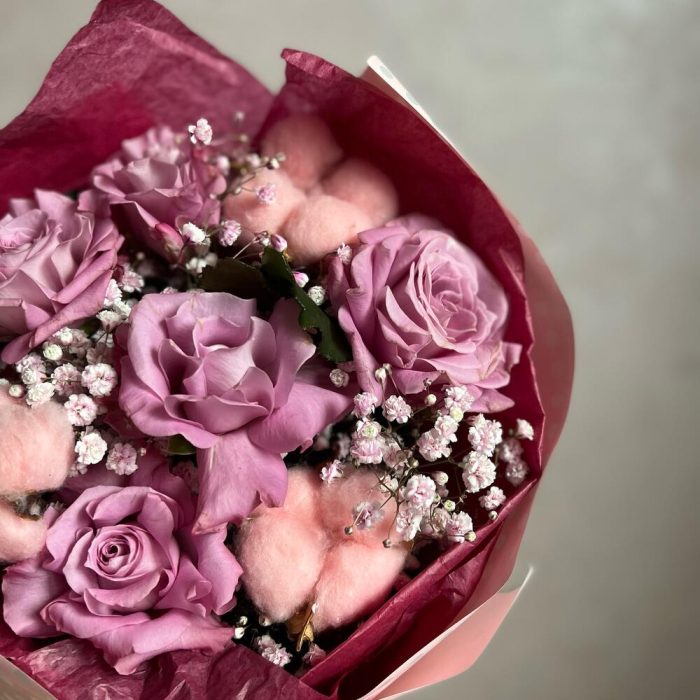 Букет из роз, гипсофил и хлопка