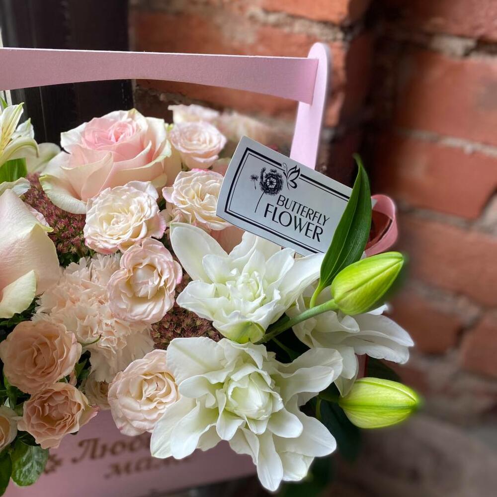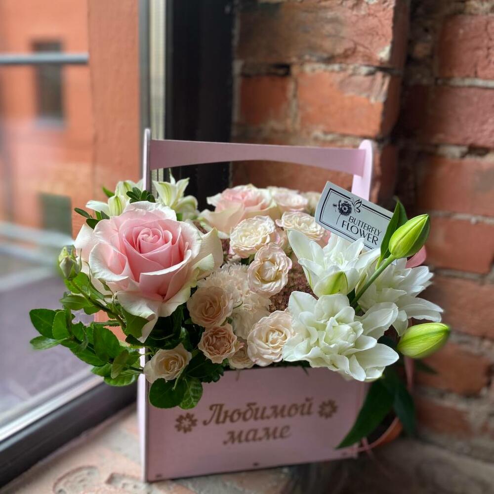 Роза – 3 шт.Лилия – 1 шт.Альстромерия – 1 шт.Гвоздика – 1 шт.Роза кустовая – 3 шт.Седум – 2 шт.Самшит – 2 шт.Бересклет – 2 шт.Ящик – 1 шт.Оазис – 1 шт.