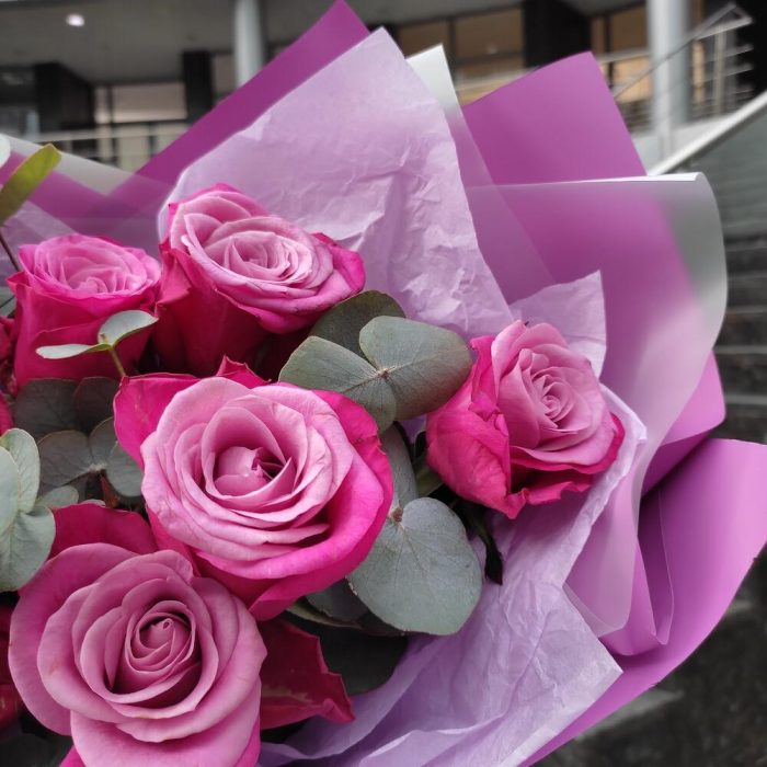 Роза – 11 шт.Эвкалипт – 1 шт.Лента – 2 шт.Упаковка дизайнерская – 2 шт.