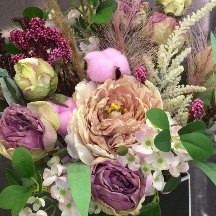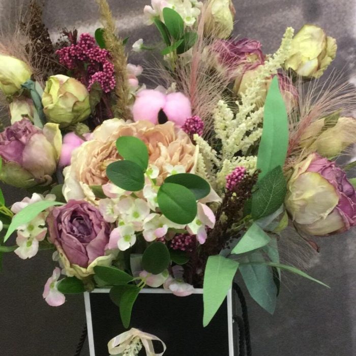 Пионовидная роза – 3 шт.Сухоцветы – 6 шт.хлопок искусственный окрашенный – 2 шт.