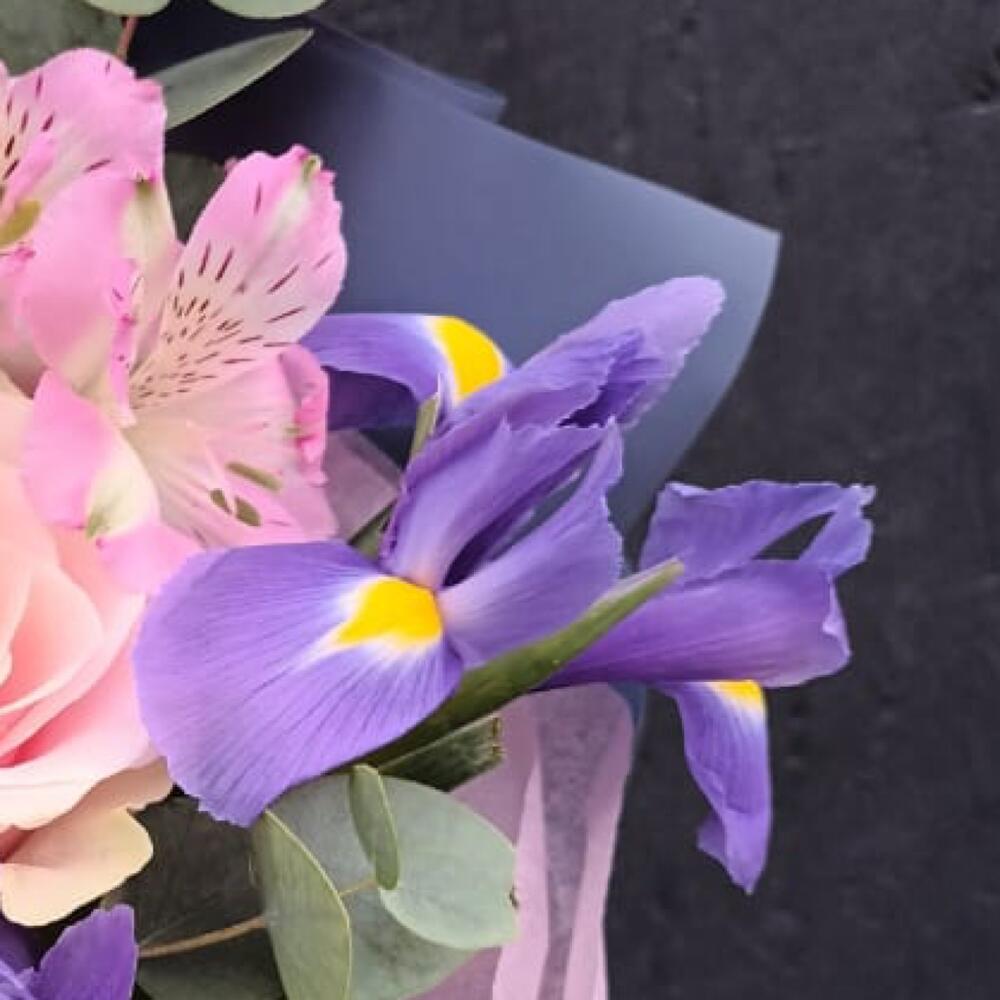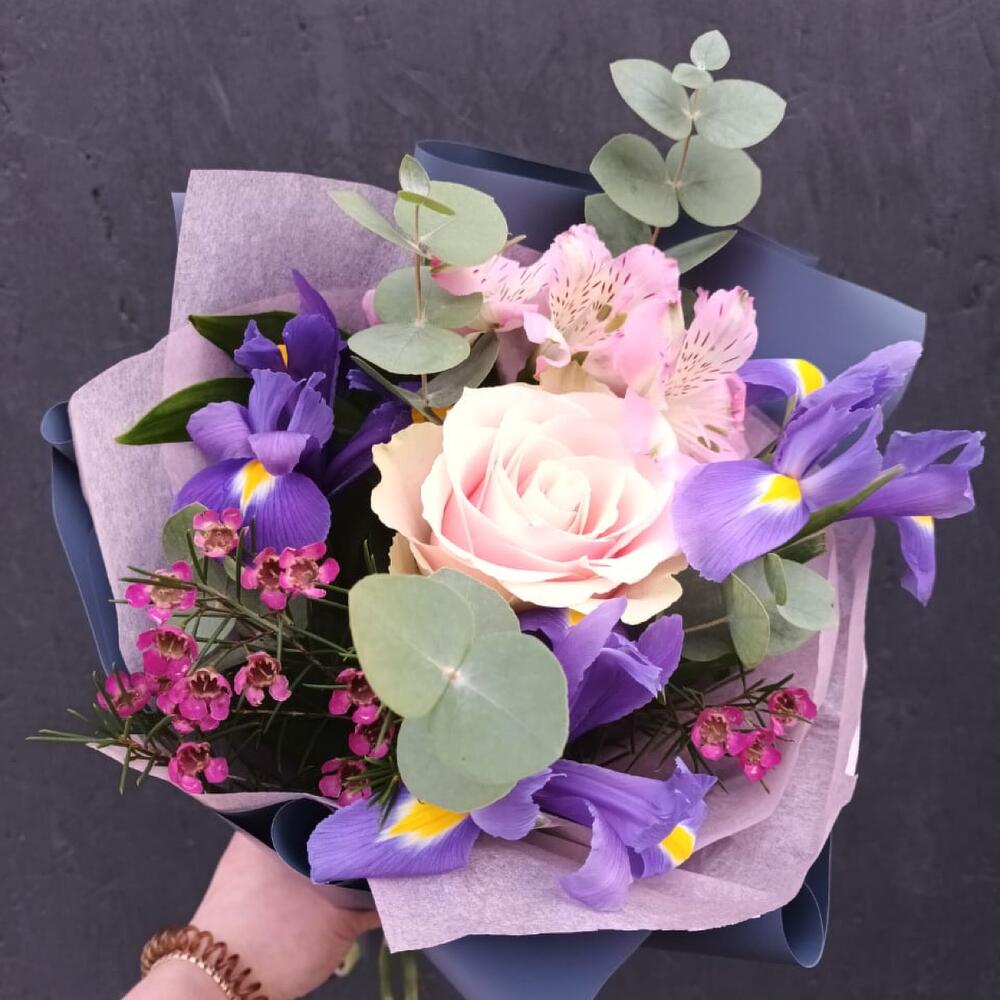 Ирис – 3 шт.Роза – 1 шт.Альстромерия – 1 шт.Ваксфлауэр – 1 шт.Эвкалипт – 5 шт.Упаковка дизайнерская – 2 шт.Лента атласная – 1 шт.