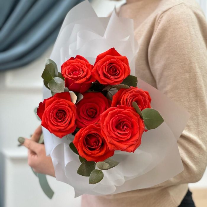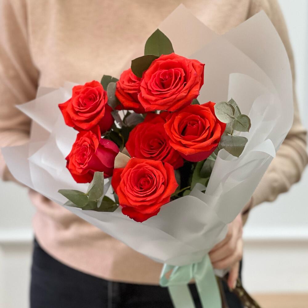 Роза красная Эквадор – 7 шт.Эвкалипт – 2 шт.Корейская пленка – 2 шт.Лента атласная – 1 шт.
