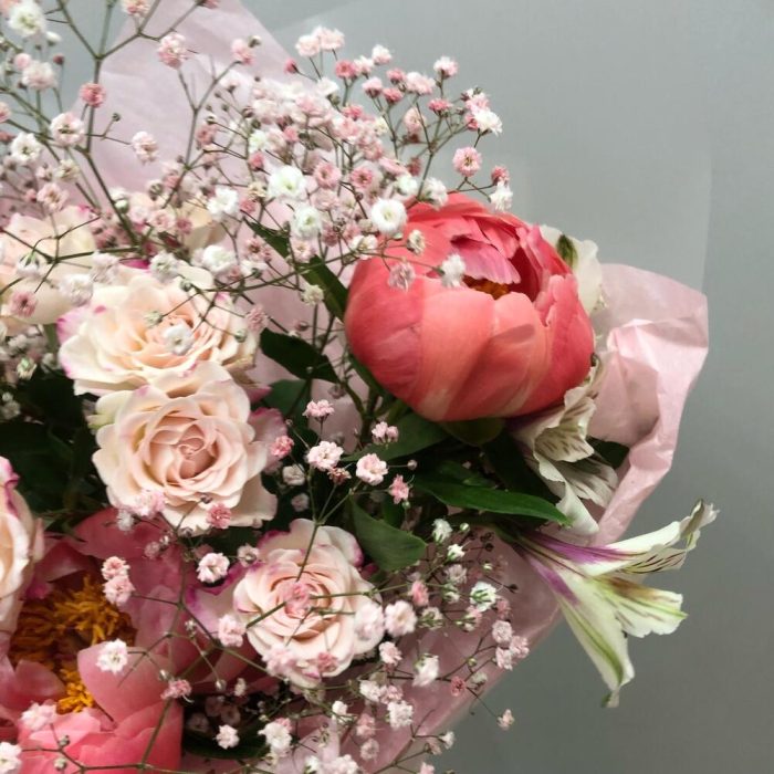 Пион – 3 шт.Роза кустовая – 1 шт.Альстромерия – 2 шт.гипсофтла – 1 шт.Тишью – 1 шт.Пленка дизайнерская – 1 шт.Лента атласная – 1 шт.