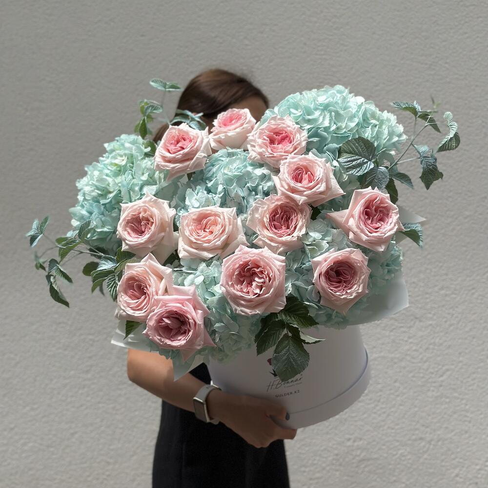 Цветы в коробке пионовидная роза,кустовая хризантема и эвкалипт