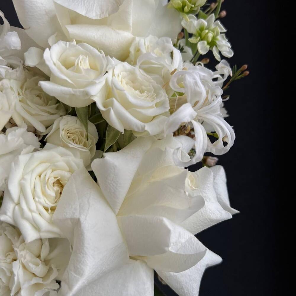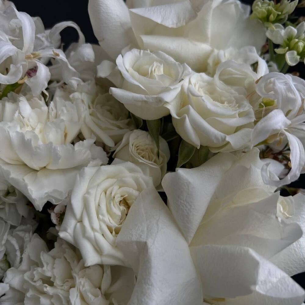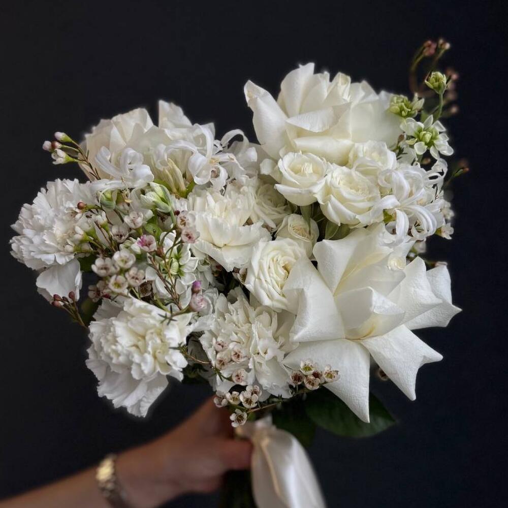 Роза белая – 3 шт.Кустовая роза – 3 шт.Маттиола белая – 3 шт.Диантус – 5 шт.Нигелла – 2 шт.Хамелациум – 2 шт.Атласная лента – 1 шт.