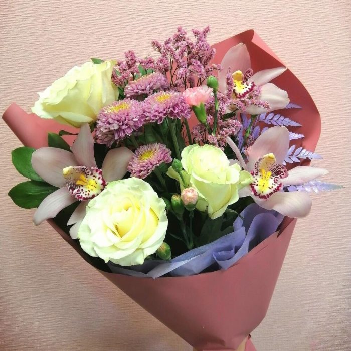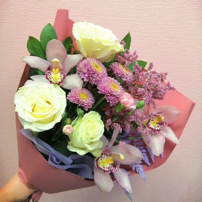 Лента – 1 шт.Лимониум – 2 шт.Папоротник – 1 шт.Хризантема кустовая – 1 шт.Роза Эквадор – 3 шт.Гвоздика – 2 шт.Упаковка дизайнерская – 1 шт.Рускус сочи – 4 шт.Орхидея цветок – 3 шт.