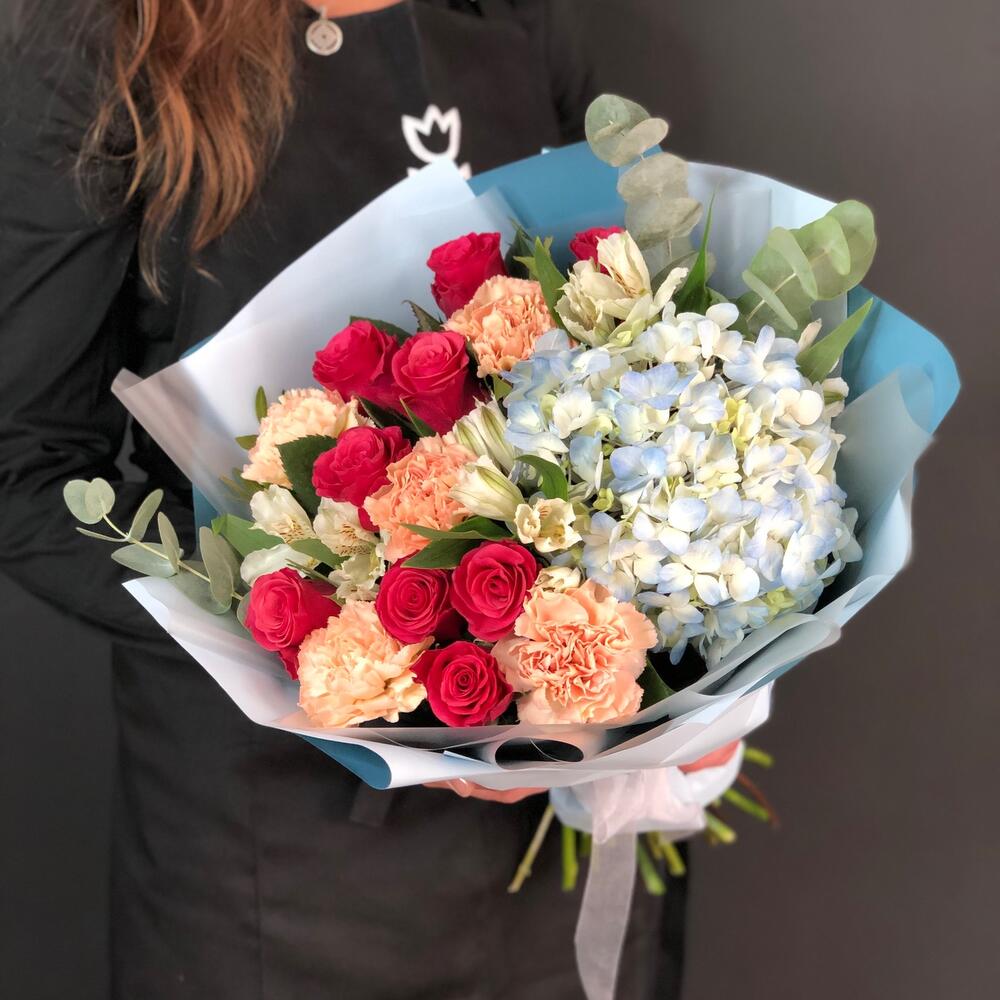 Гортензия – 1 шт.Роза Эквадор – 9 шт.Диантус – 5 шт.Эвкалипт – 2 шт.Альстромерия – 3 шт.Крафт упаковка – 3 шт.