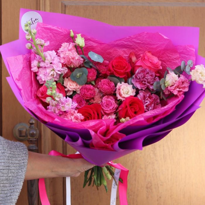 Букет премиум “Малиновый рай” с пионовидными розами, лизиантусом и маттиолой