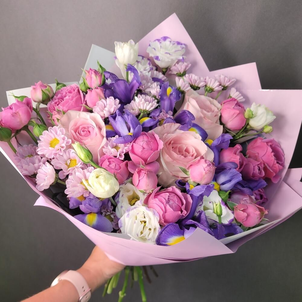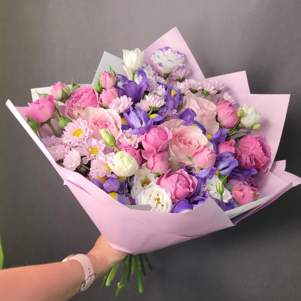 Букет роз, ирисов и сантини «Магнитизм»