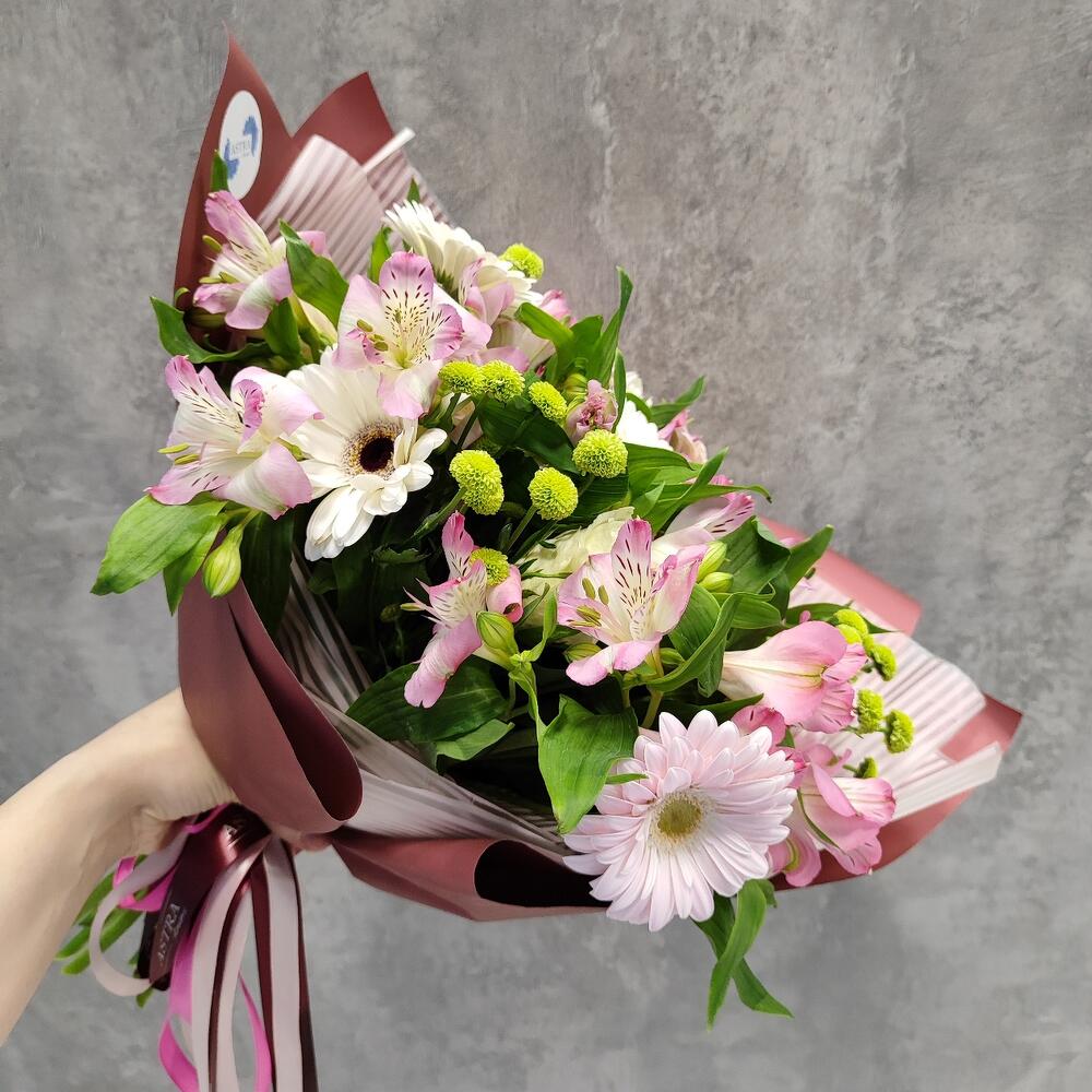Альстромерия – 7 шт.Гербера – 6 шт.Роза – 3 шт.хризантема кустовая помпон – 3 шт.Авторская упаковка – 1 шт.Атласная лента – 1 шт.
