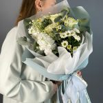 Лента – 1 шт.Маттиола – 2 шт.Хризантема Сантини – 2 шт.Эвкалипт – 1 шт.Упаковка – 1 шт.Матрикария – 4 шт.Фисташка – 2 шт.Роза Мондиаль – 3 шт.