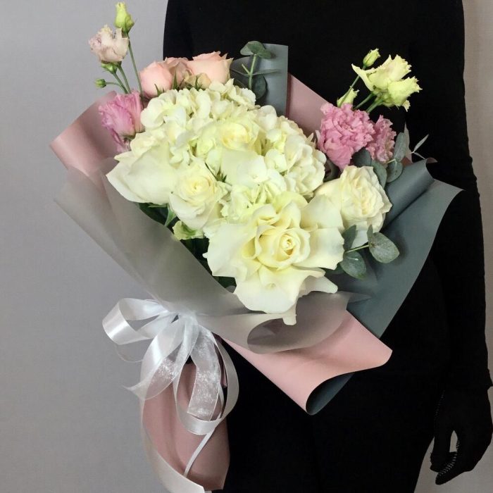 Букет с гортензией, розой Мондиаль и эустомой “Нежные нотки”