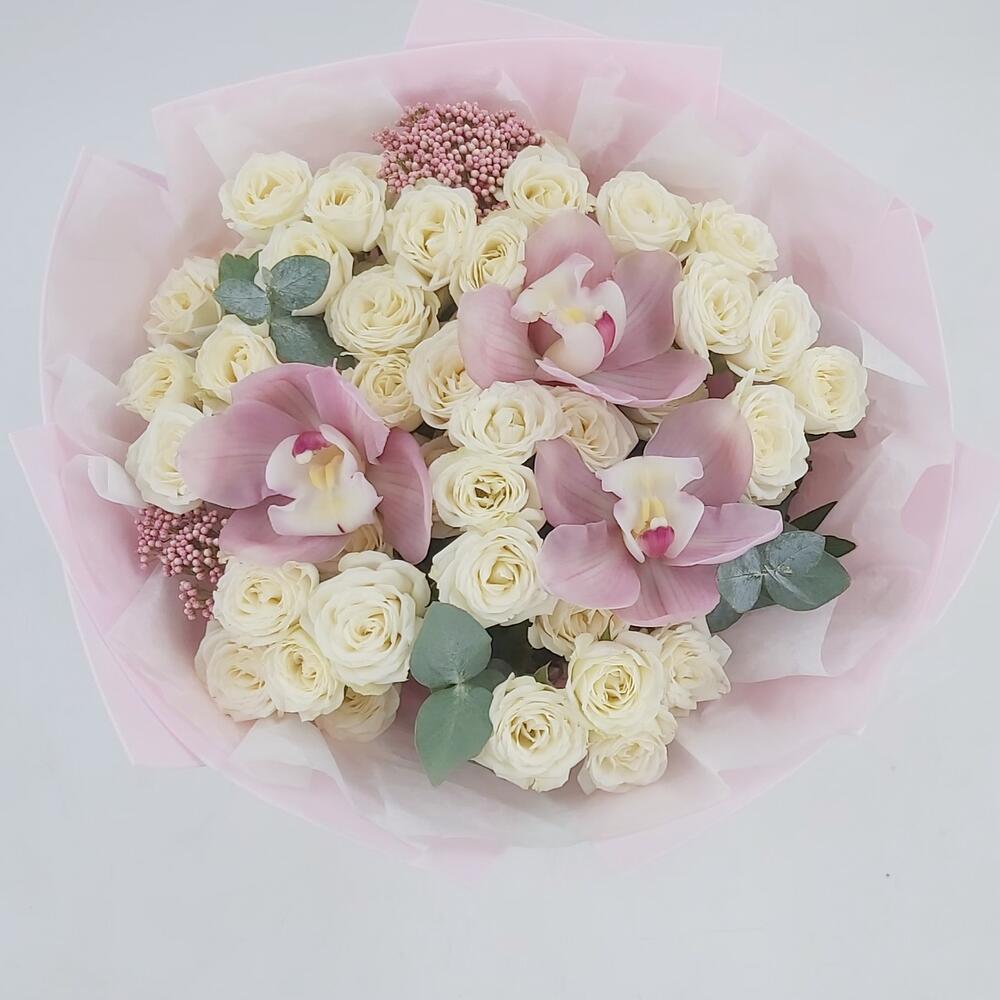Роза кустовая Эквадор – 9 шт.Орхидея цимбидиум бутон – 3 шт.Озотамнус розовый – 5 шт.Эвкалипт – 3 шт.Пистация – 5 шт.Упаковка дизайнерская – 1 шт.