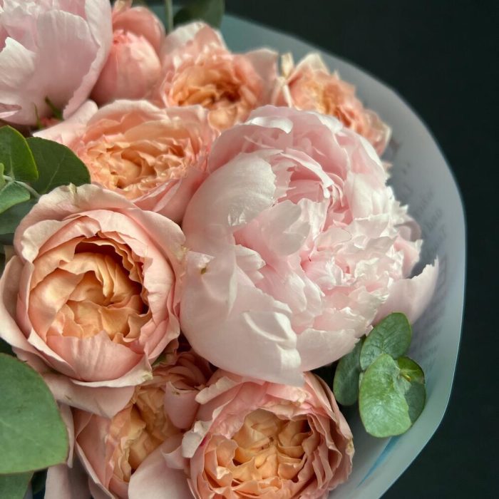 Эвкалипт – 5 шт.Атласная лента – 1 шт.Кустовая пионовидная роза – 2 шт.декоративная упаковка – 1 шт.пионы – 3 шт.
