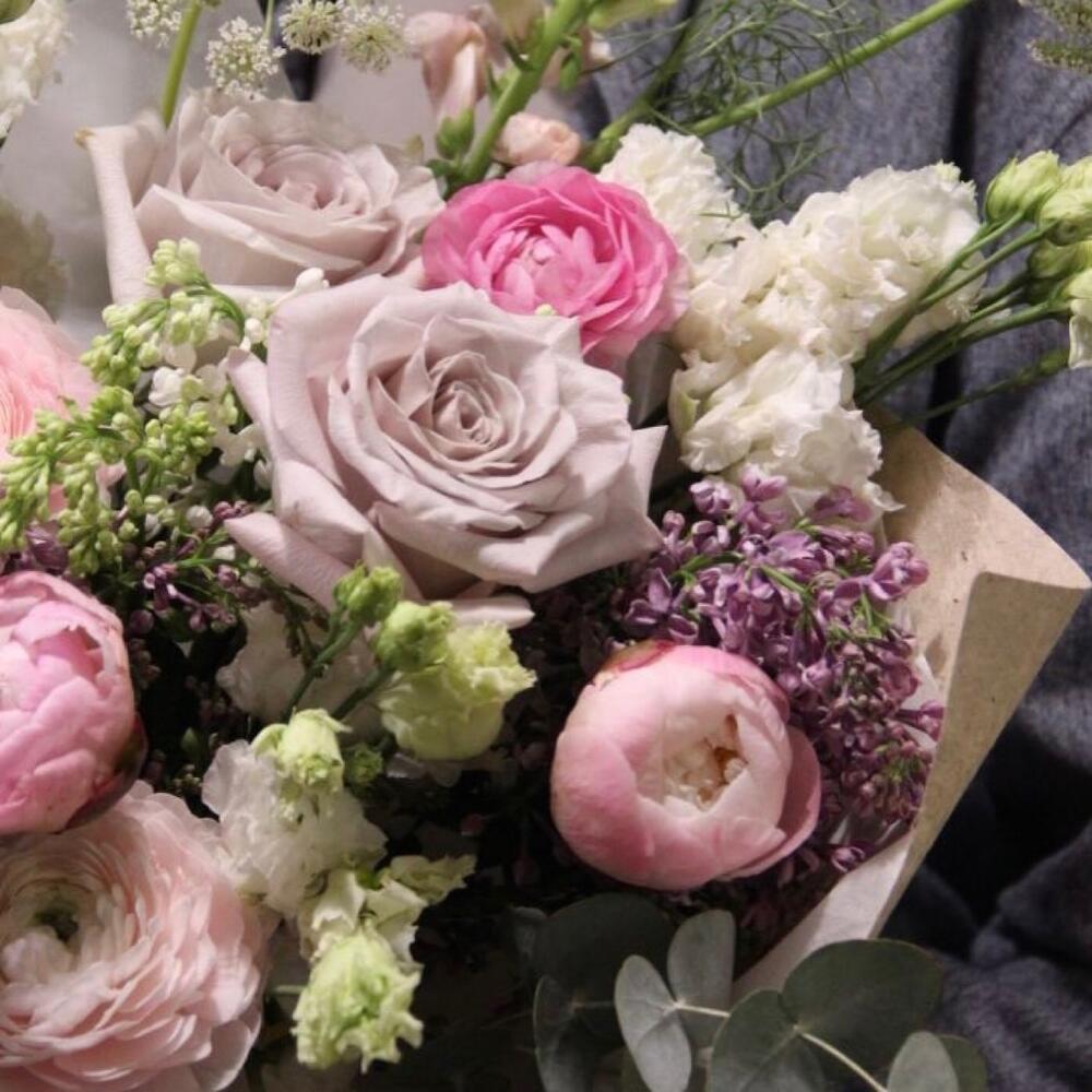 Букет с пионами, сиренью и ранункулюсами