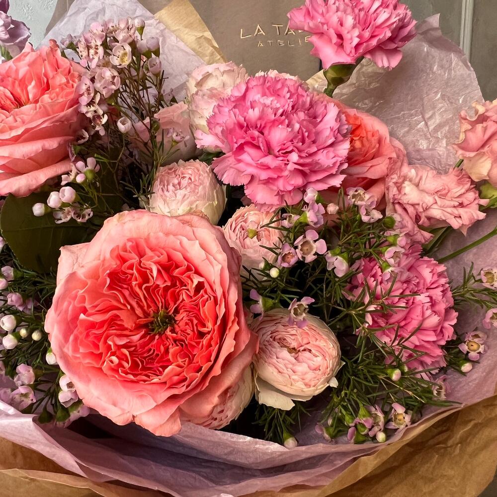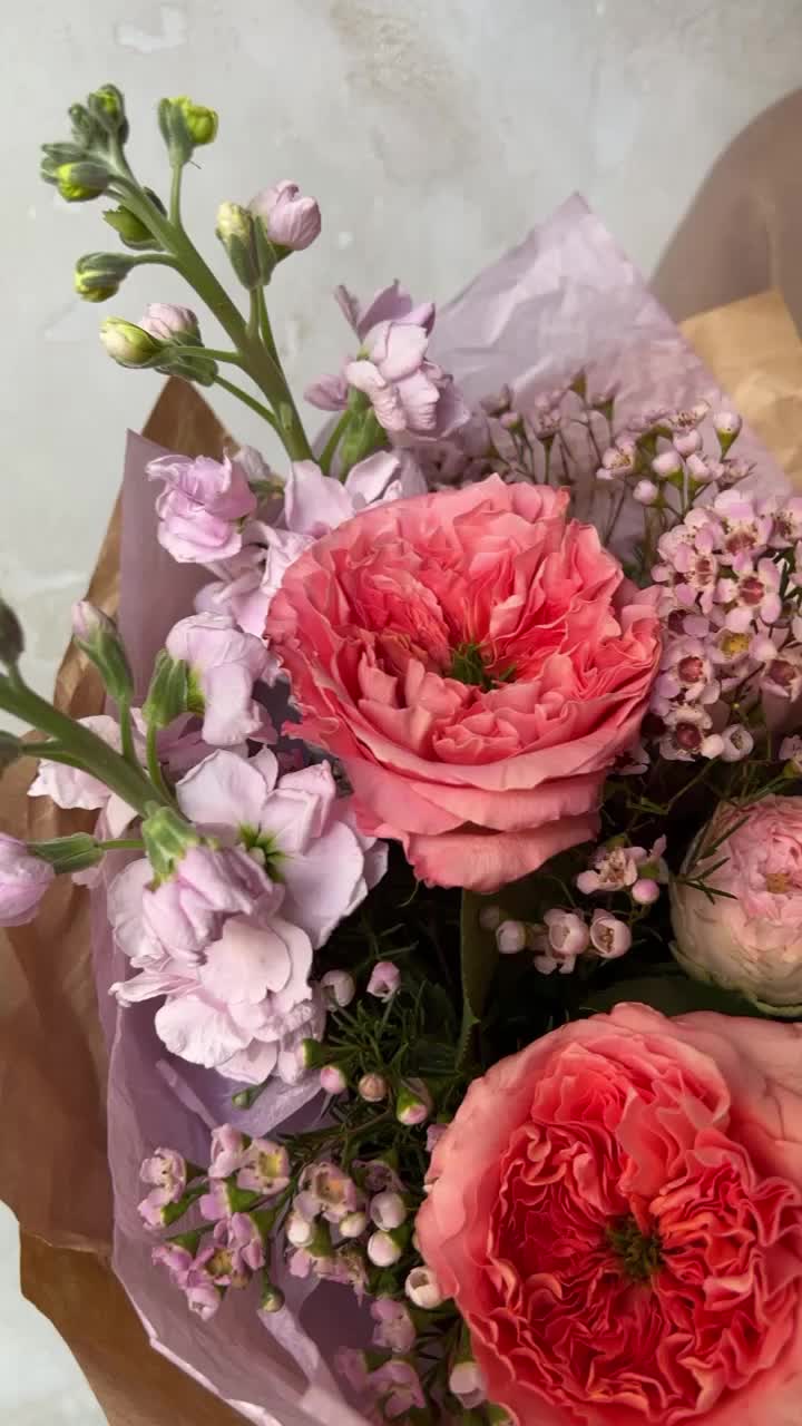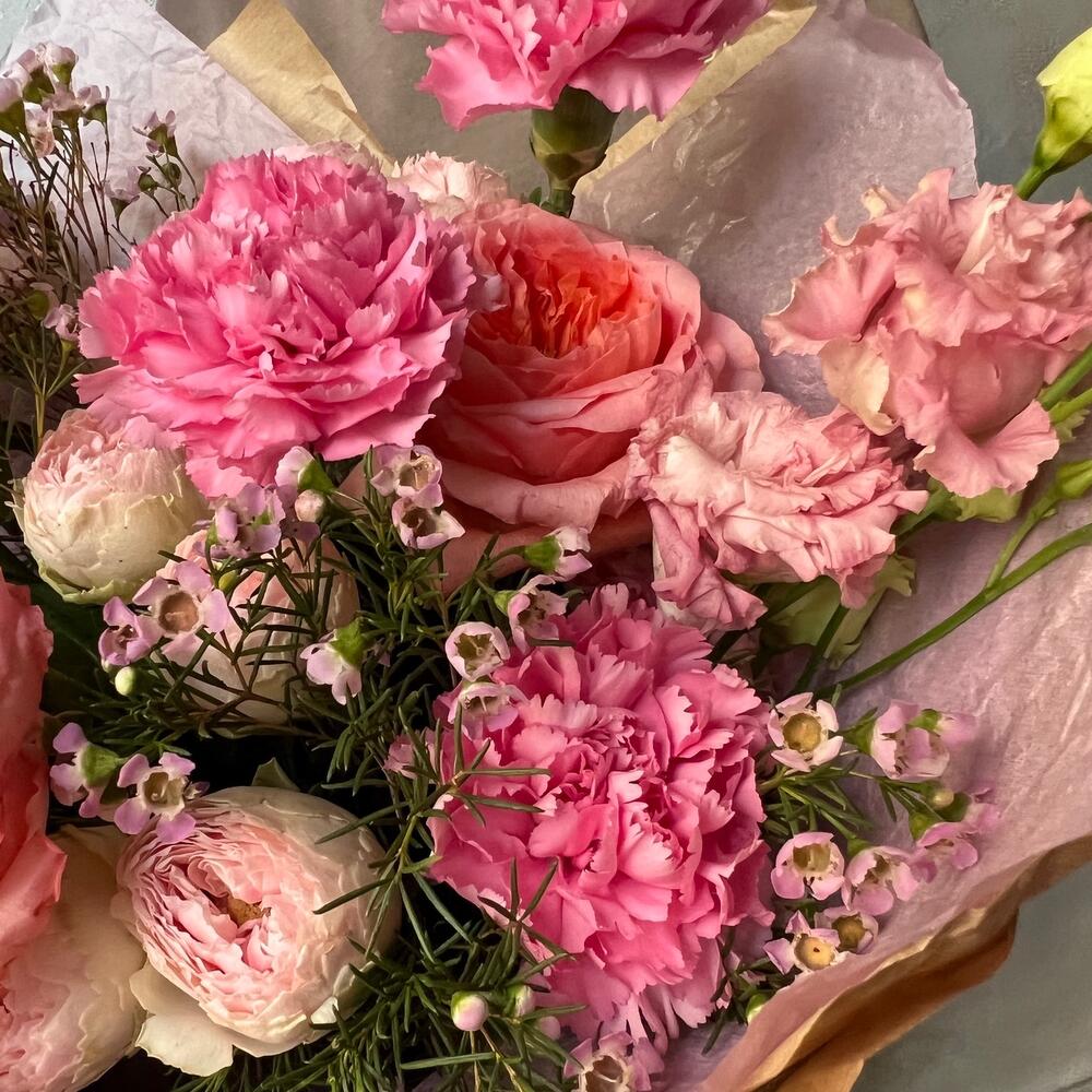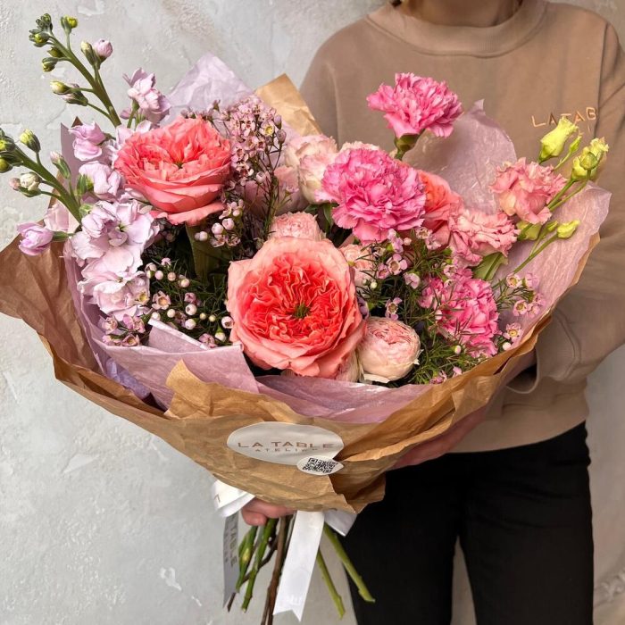 Пионовидная роза – 3 шт.Роза пионовидная кустовая – 2 шт.Гвоздика сортовая – 3 шт.Маттиола – 2 шт.Ваксфлауэр – 3 шт.Лизиантус – 1 шт.Упаковка дизайнерская – 1 шт.