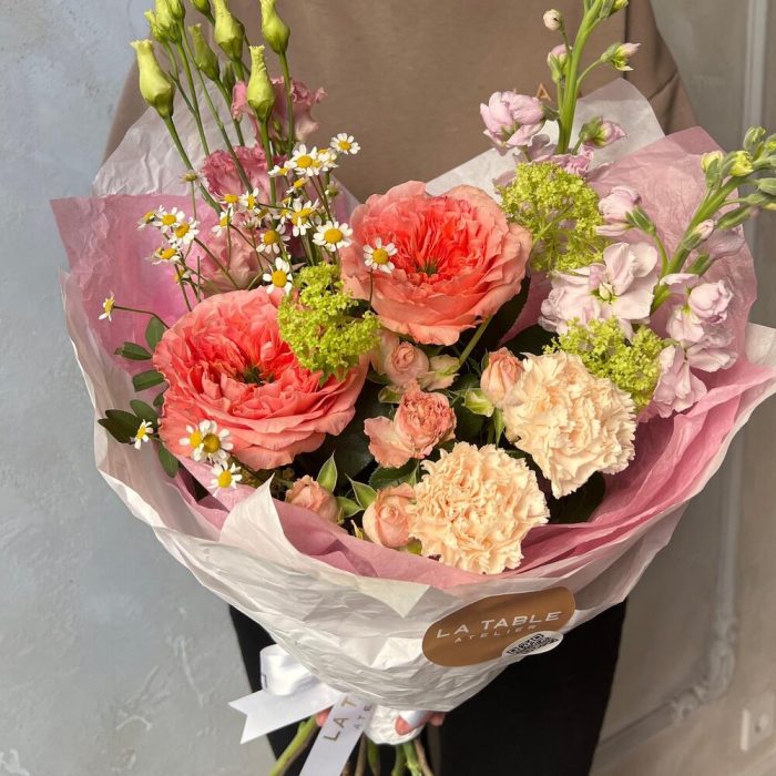 Матрикария (Ромашка Камила) – 1 шт.Роза пионовидная – 2 шт.Диантус – 2 шт.Роза кустовая пионовидная – 1 шт.Лизиантус – 1 шт.Маттиола – 2 шт.Упаковка дизайнерская – 1 шт.