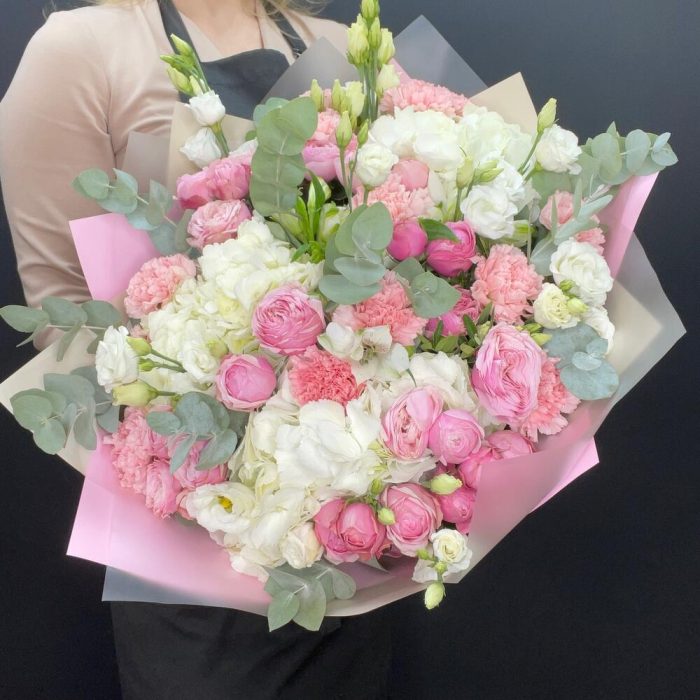 Гортензия – 3 шт.Лизиантус – 5 шт.Эвкалипт – 2 шт.Диантус – 13 шт.Роза пионовидная кустовая – 6 шт.Фисташка – 5 шт.Упаковка дизайнерская – 5 шт.
