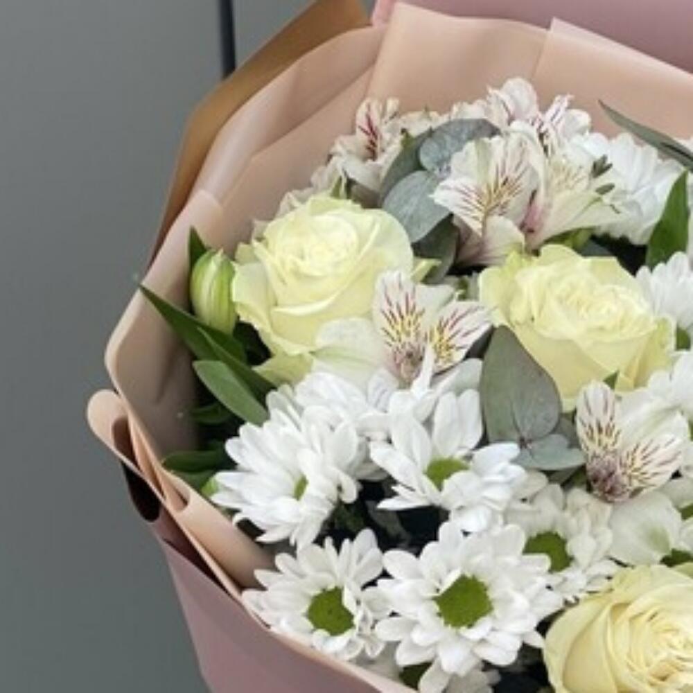Роза – 5 шт.Хризантема кустовая – 4 шт.Альстромерия – 3 шт.Упаковка дизайнерская – 1 шт.