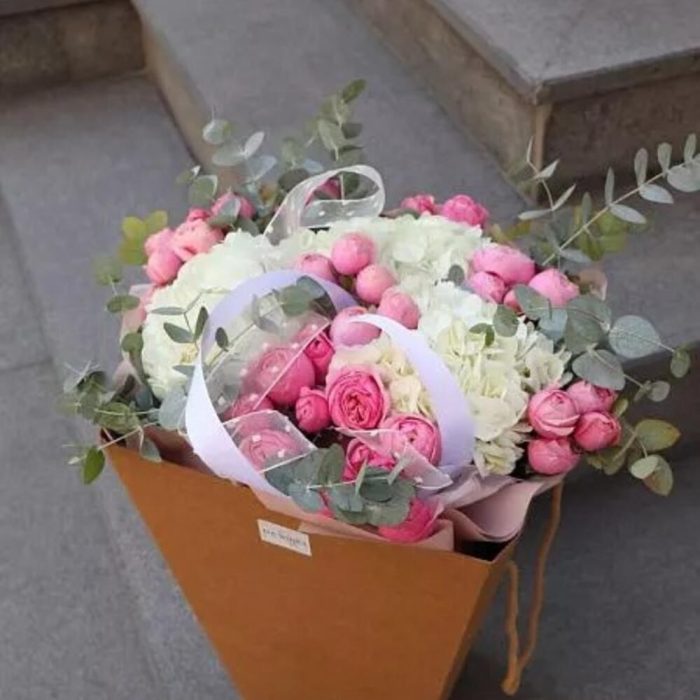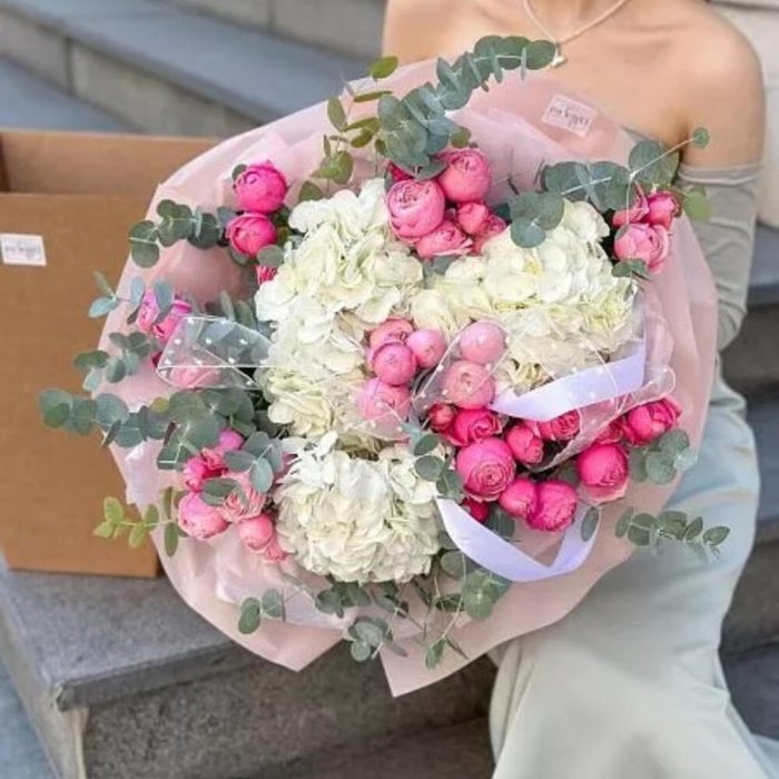 Гортензия – 3 шт. пионовидная спрей роза – 7 шт. Эвкалипт – 2 шт.