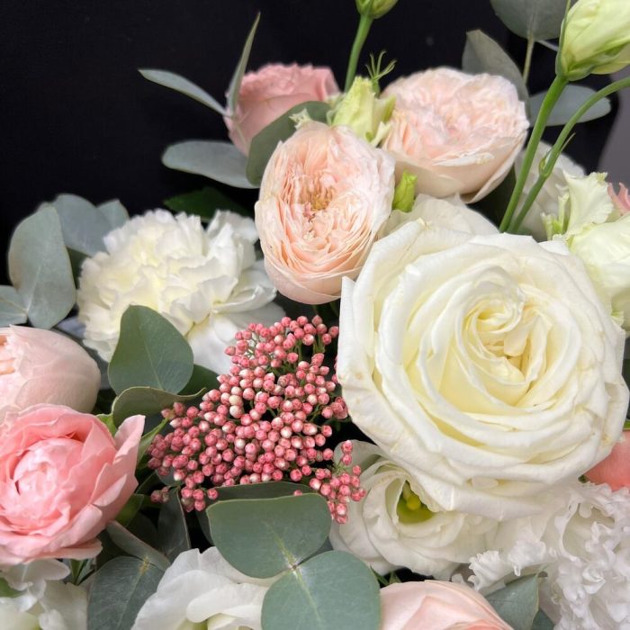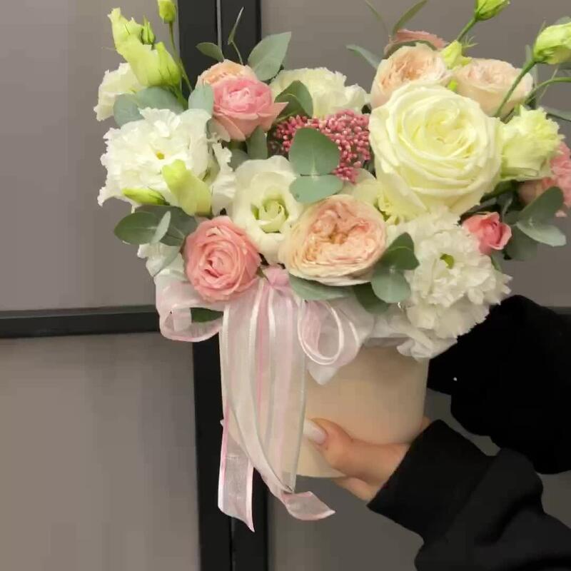 Озотамнус – 1 шт.Эвкалипт – 2 шт.Лента атласная – 2 шт.Диантус – 1 шт.Коробка шляпная – 1 шт.Оазис флористический – 1 шт.эустома махровая белая – 1 шт.роза кустовая мадам бомбастик – 1 шт.эустома розита вайт – 1 шт.роза кустовая пионовидная мэнсфилд парк – 1 шт.роза пионовидная плайя бланка – 1 шт.