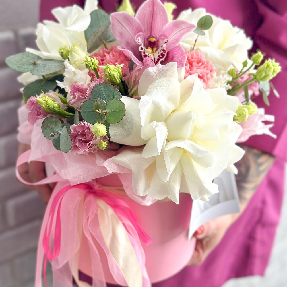 Орхидея Цимбидиум – 1 шт.Эвкалипт – 1 шт.Лизиантус махровый – 2 шт.Открыточка с вашими пожеланиями – 1 шт.роза плая бланка – 3 шт.диантус сортовой розовый – 3 шт.шляпная коробка с лентами и оазисом – 1 шт.