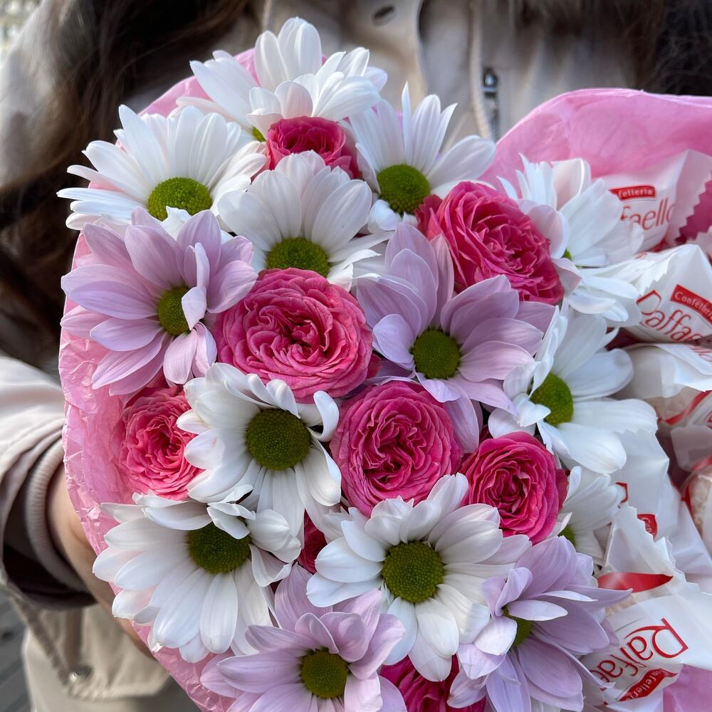 Хризантема кустовая – 2 шт.Кустовая роза – 1 шт.раффаэлло конфеты – 8 шт.Бумага тишью – 1 шт.Коробка сердце – 1 шт.Оазис флористический – 1 шт.