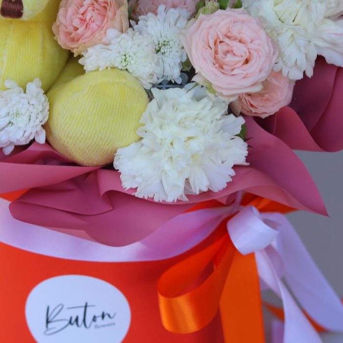 Яркая, насыщенная и воздушная композиция с мишкой, выполненная из стокйих цветов: кустовой розы, сантини и диантусов.Такая композиция точно понравится яркой и энергичной получательнице, и будет долго радовать её.К композиции прилагается открытка с вашими пожеланиями и приятный комплимент от нашего магазина – шоколадка.Мы также будем рады отправить вместе с композицией конфеты, шоколад ручной работы или б/а вино по вашим пожеланиям, просто напишите нам в личные сообщения. Заказывая нашу композицию, Вы всегда получите исключительный сервис и заботу о клиенте