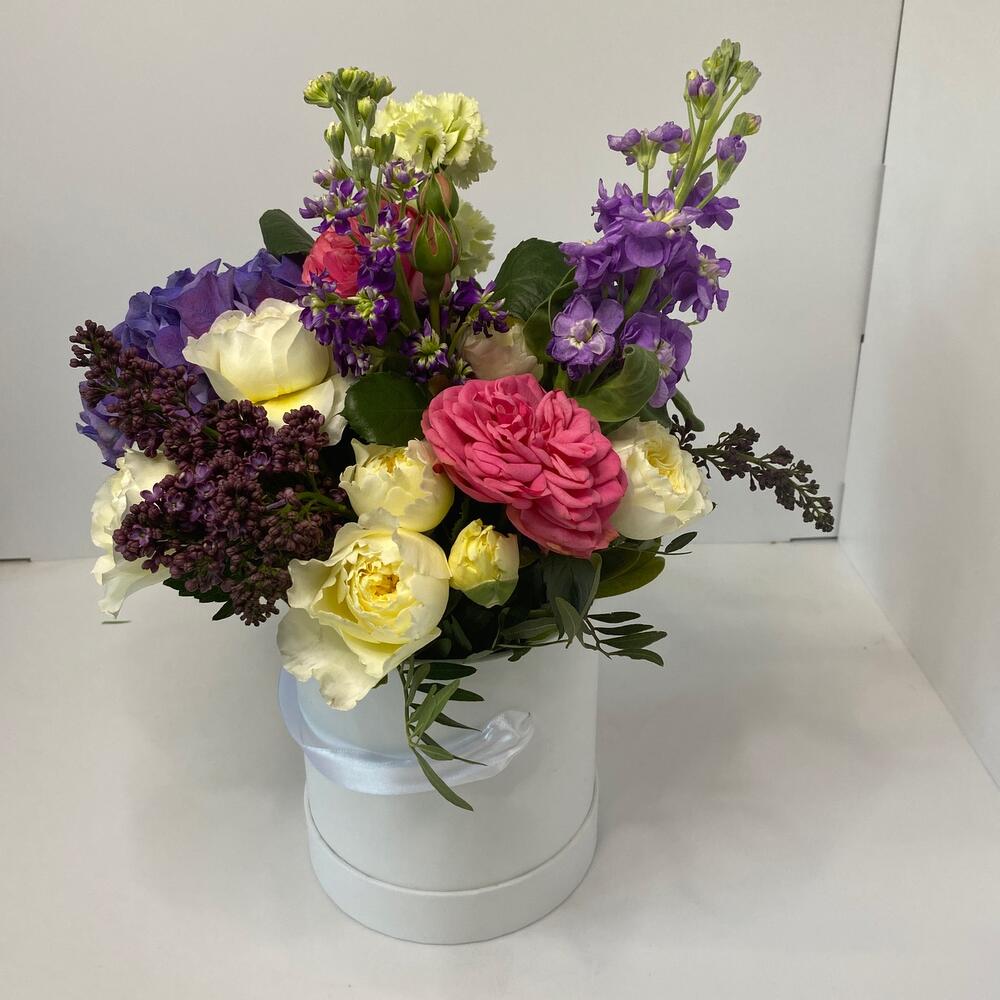 Гортензия – 1 шт.Кустовая роза – 4 шт.Шляпная коробка – 1 шт.Оазис флористический – 1 шт.Маттиола – 2 шт.Сирень – 3 шт.Фисташка – 1 шт.Диантус – 2 шт.