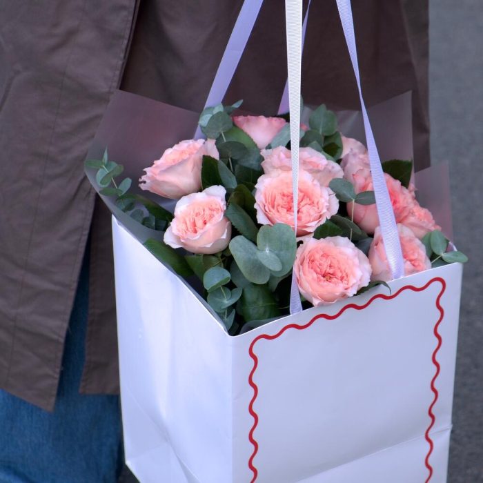 Круглая корзина из пионовидных роз, белых гвоздик и махровых лизиантусов