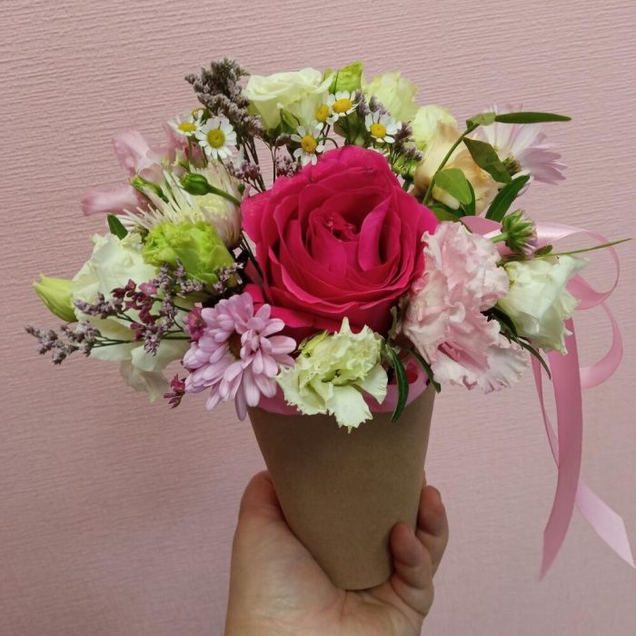 Роза кустовая – 1 шт.Роза – 1 шт.Оазис флористический – 1 шт.зелень декоративная – 1 шт.эустома (лизиантус) – 1 шт.стакан крафт – 1 шт.