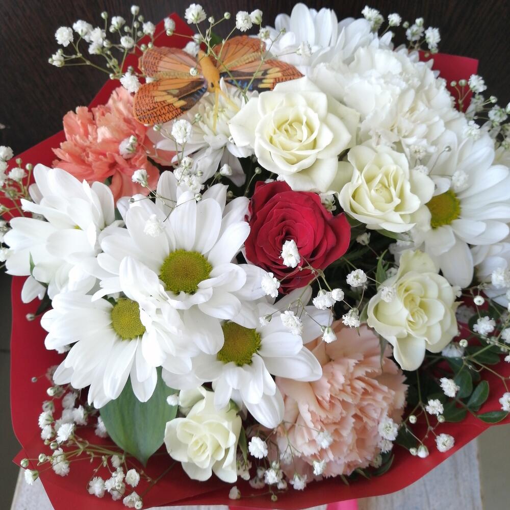 Гипсофила – 1 шт.Роза кустовая – 1 шт.Рускус – 1 шт.Хризантема кустовая – 1 шт.Упаковка – 1 шт.Гвоздика – 3 шт.Бабочка декоративная – 1 шт.Фисташка пучок – 1 шт.