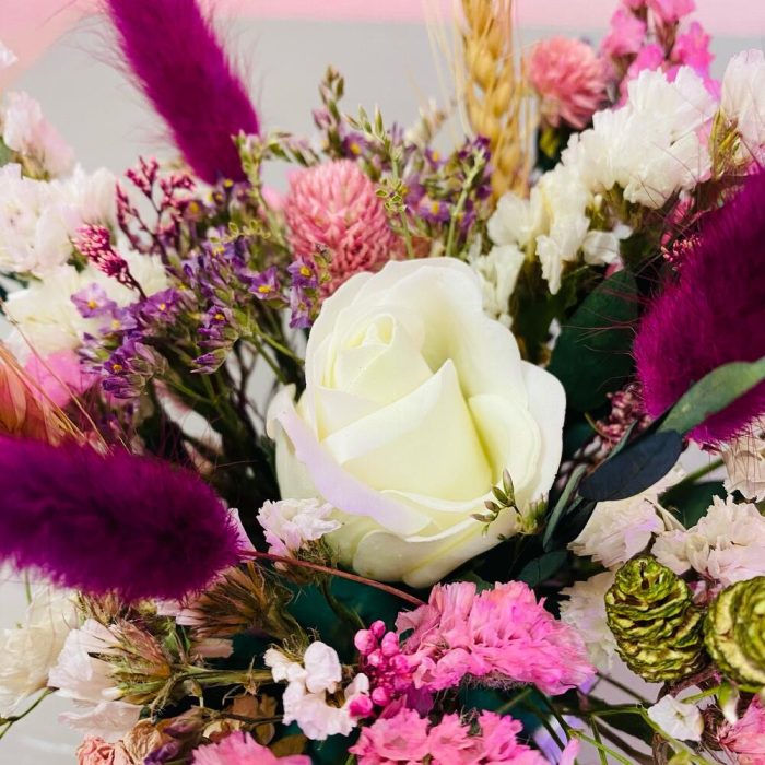 Роза сухоцвет – 1 шт.роза из мыла – 1 шт.Пшеница – 2 шт.Лимониум – 1 шт.Эвкалипт – 2 шт.Озотамнус – 1 шт.Лагурус – 3 шт.Статица – 2 шт.Оазис флористический – 1 шт.Кашпо керамическое – 1 шт.