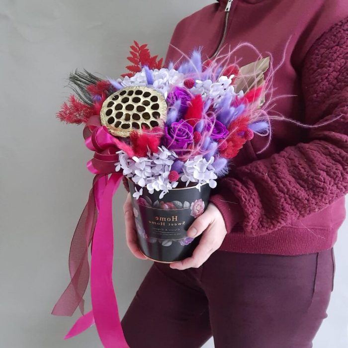Роза стабилизированная – 3 шт.лагурус пучок – 2 шт.гортензия стабилизированная – 1 шт.ковыль пучок – 1 шт.краспедия стабилизированная – 6 шт.аспарагус стабилизированный – 2 шт.комыш декоративный – 3 шт.пальма сухоцвет – 1 шт.папоротник стабилизированный – 1 шт.перо павлина декоративное – 1 шт.Лотос (коробочка) – 1 шт.Оазис флористический – 1 шт.Лента атласная – 2 шт.Кашпо металлическое – 1 шт.