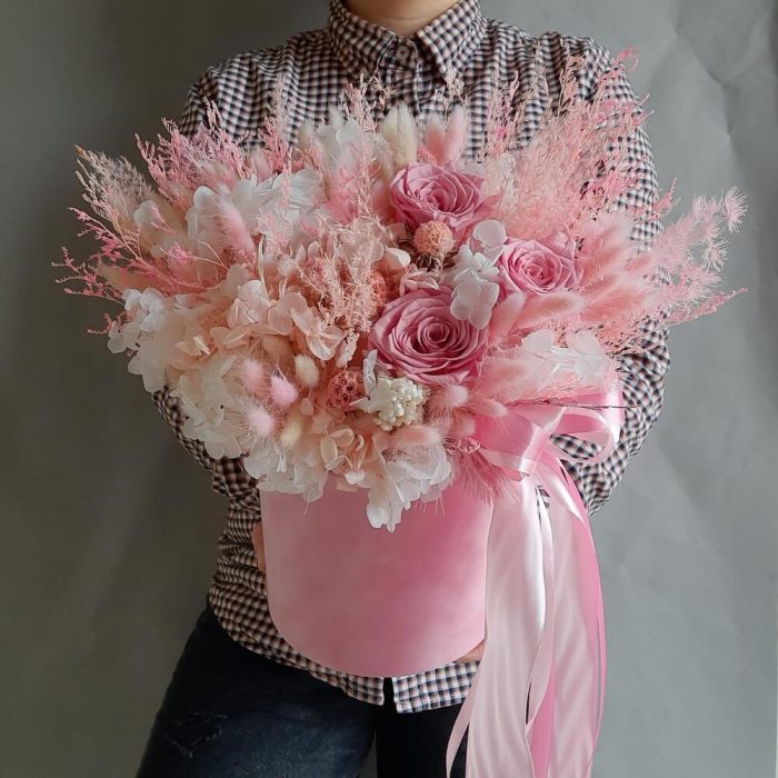 Роза стабилизированная – 3 шт.гортензия стабилизированная – 2 шт.лагурус (сухоцвет)пучок – 2 шт.Лимониум – 2 шт.аспарагус стабилизированный – 2 шт.папоротник стабилизированный – 3 шт.ветки декоративные – 15 шт.Оазис для сухоцветов – 1 шт.Коробка шляпная бархатная – 1 шт.Лента атласная – 3 шт.перо декоративное – 2 шт.