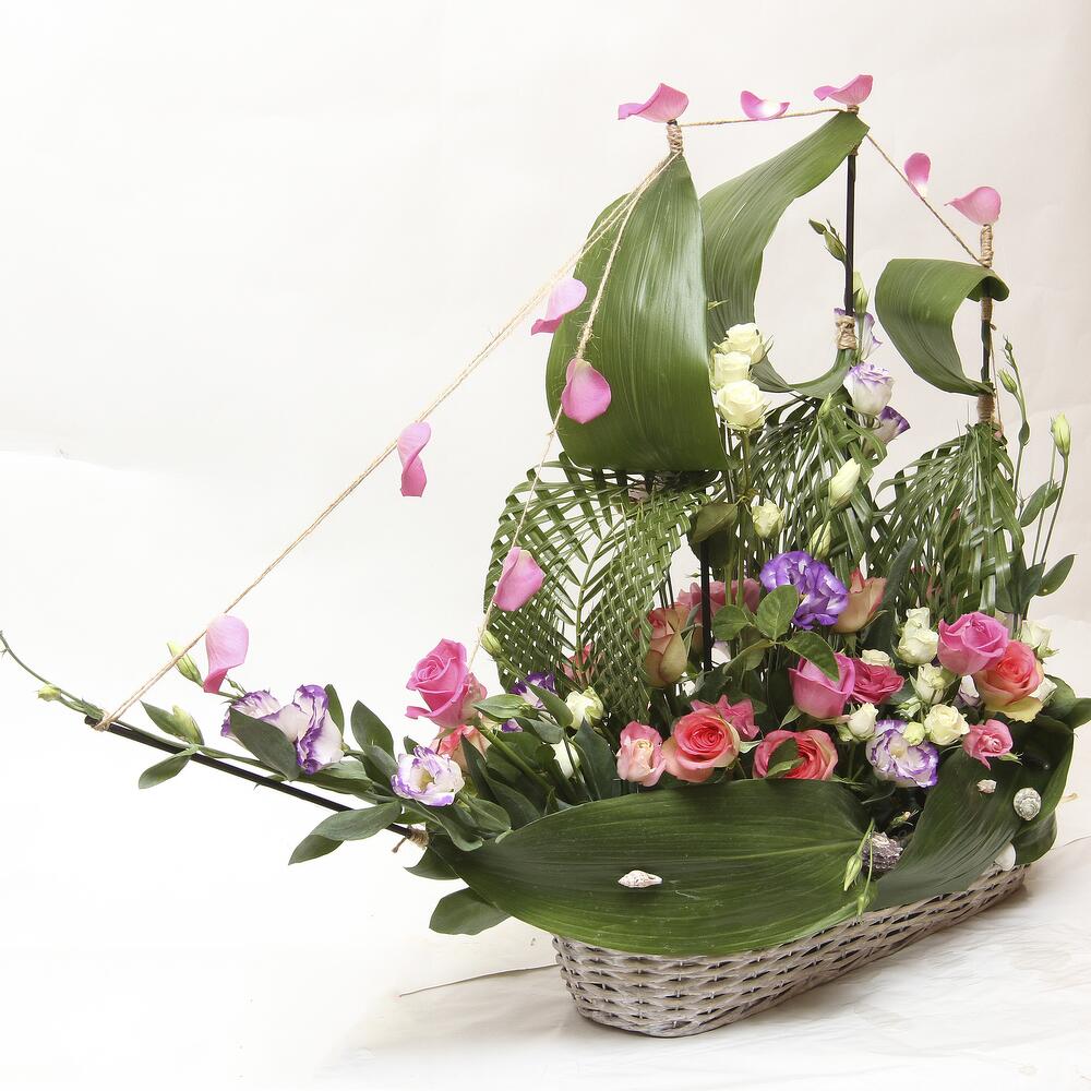 Кустовая роза – 10 шт.роза штучная – 10 шт.Эустома – 3 шт.Аспидистра – 8 шт.Робелини – 3 шт.Корзина – 1 шт.Оазис – 2 шт.Декор – 10 шт.мачта – 3 шт.Шпагат – 1 шт.Лепестки – 17 шт.Клей – 1 шт.Булавка – 5 шт.Пленка – 1 шт.
