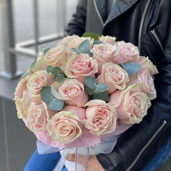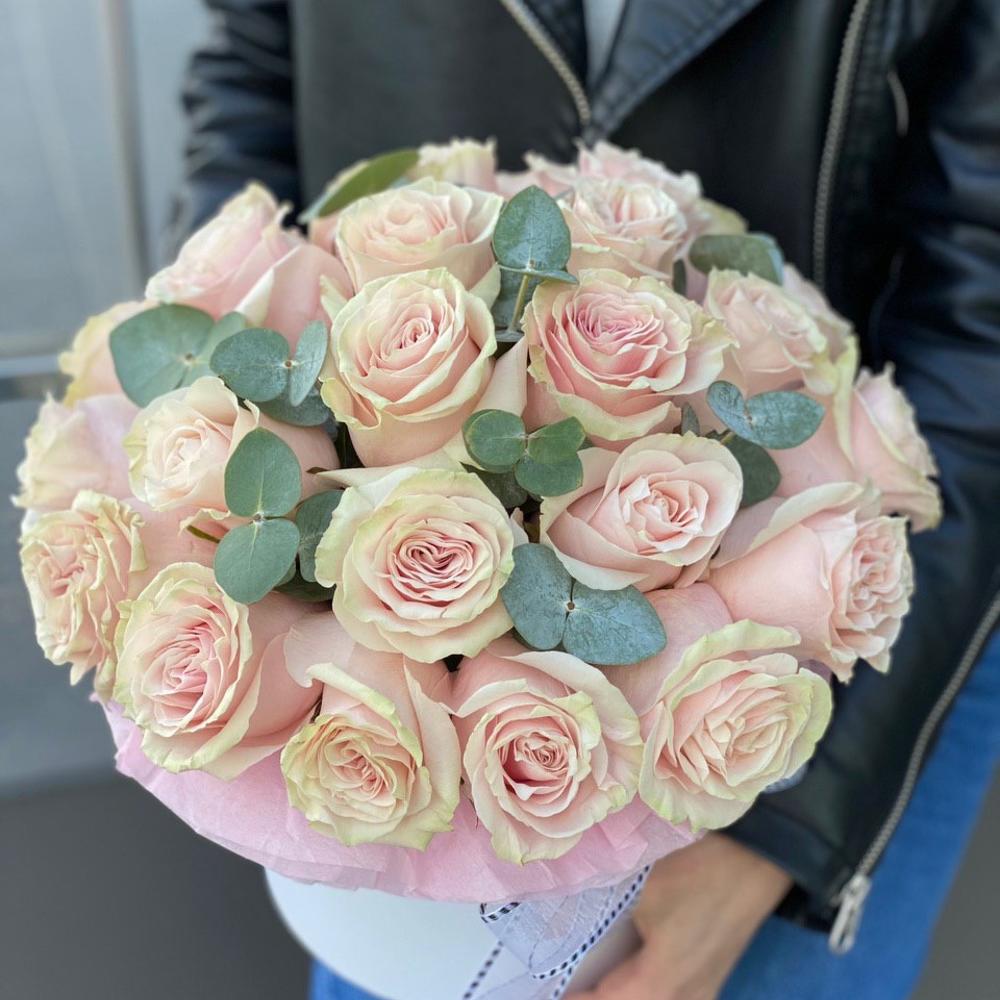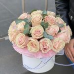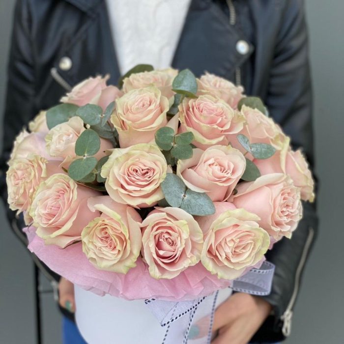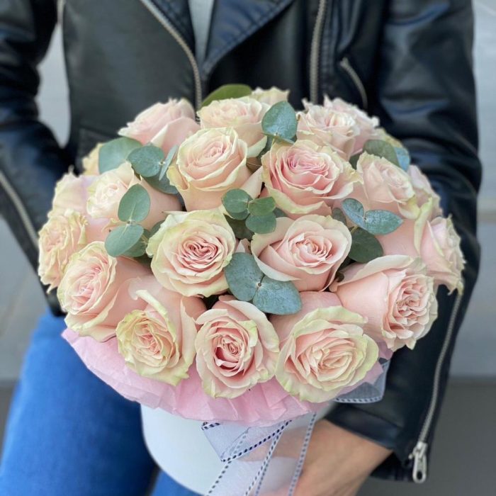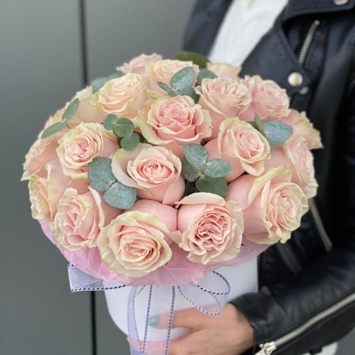 Цветы в коробке пионовидная роза,кустовая хризантема и эвкалипт