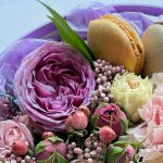 Гиперикум – 1 шт.Хлопок – 1 шт.Кустовая роза – 3 шт.Гвоздика – 1 шт.Коробка шляпная – 1 шт.Оазис флористический – 1 шт.макарон (пирожное) – 4 шт.райз – 1 шт.