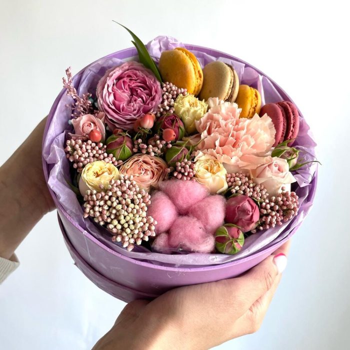 Гиперикум – 1 шт.Хлопок – 1 шт.Кустовая роза – 3 шт.Гвоздика – 1 шт.Коробка шляпная – 1 шт.Оазис флористический – 1 шт.макарон (пирожное) – 4 шт.райз – 1 шт.