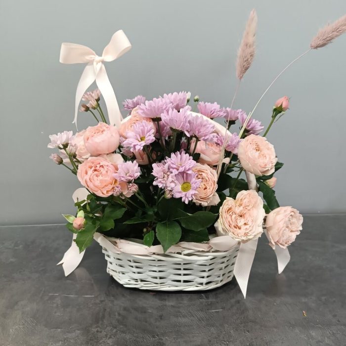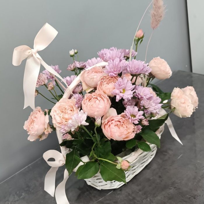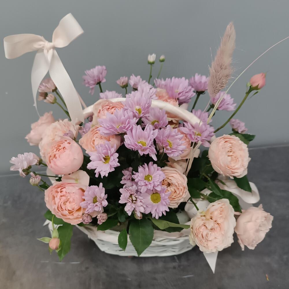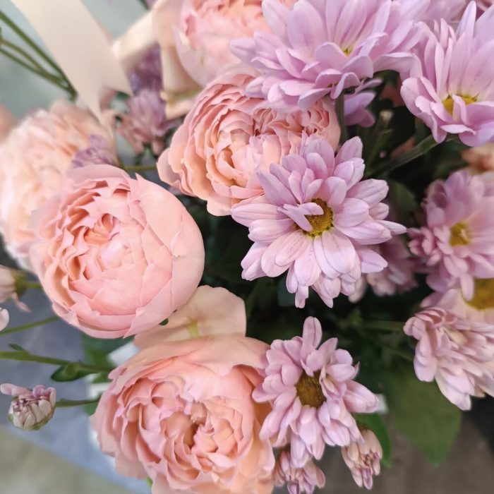 джульетта роза пионовидная – 4 шт. Хризантема Ромашковая – 2 шт. открытка с вашими пожеланиями – 1 шт.