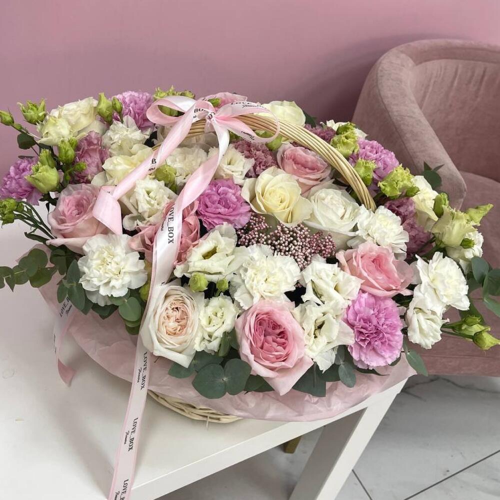 Роза пионовидная – 5 шт.Диантус – 10 шт.Эустома – 6 шт.Роза Эквадор – 5 шт.Озотамнус розовый – 1 шт.Эвкалипт – 6 шт.Корзина плетеная – 1 шт.