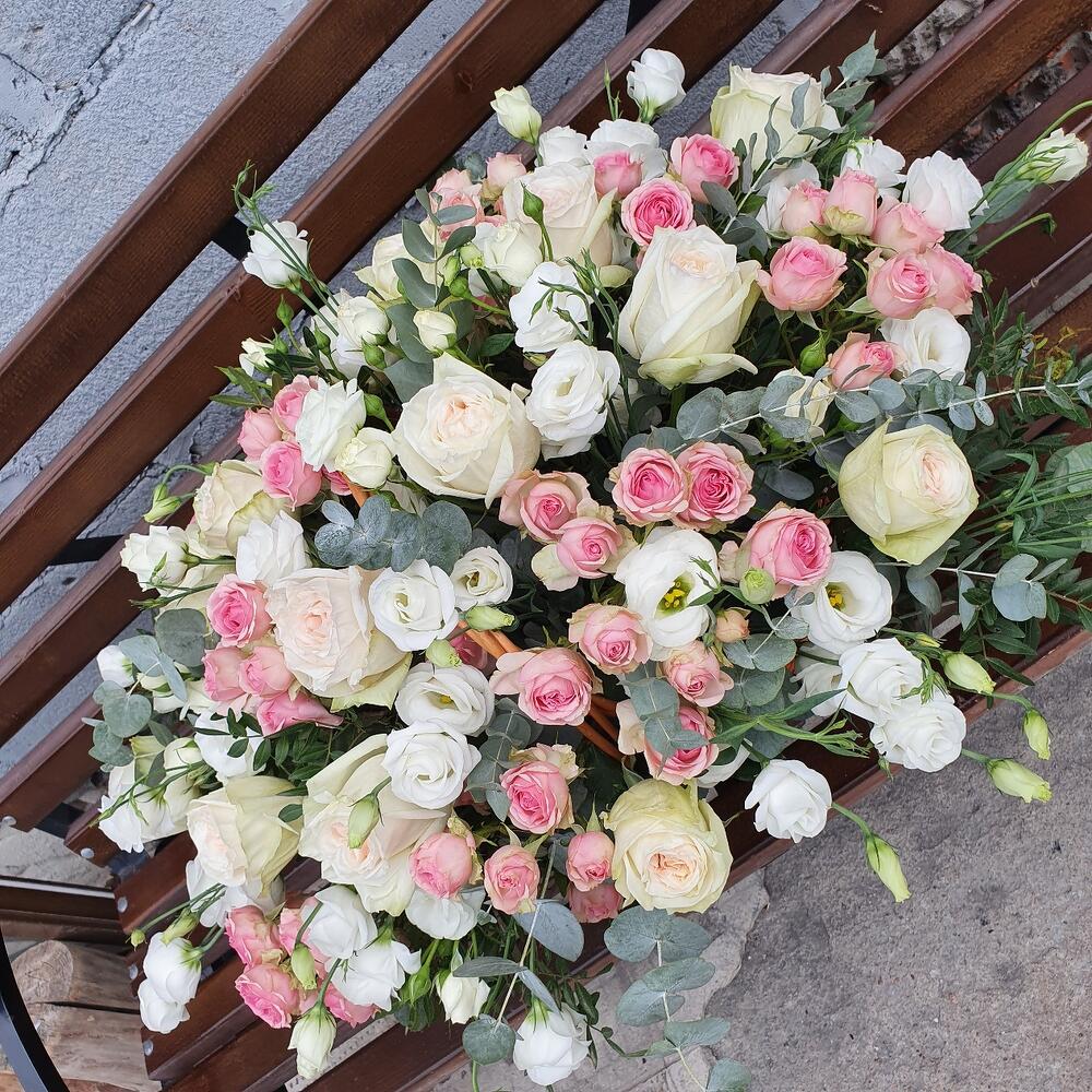 Корзина плетеная – 1 шт.Оазис флористический – 4 шт.Лизиантус – 10 шт.Кустовая роза – 10 шт.Эвкалипт – 10 шт.Роза пионовидная – 15 шт.Фисташка – 5 шт.
