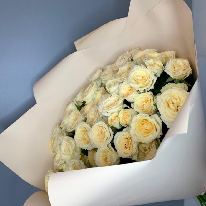 Роза кустовая – 15 шт.Лента атласная – 2 шт.Дизайнерская упаковка – 2 шт.