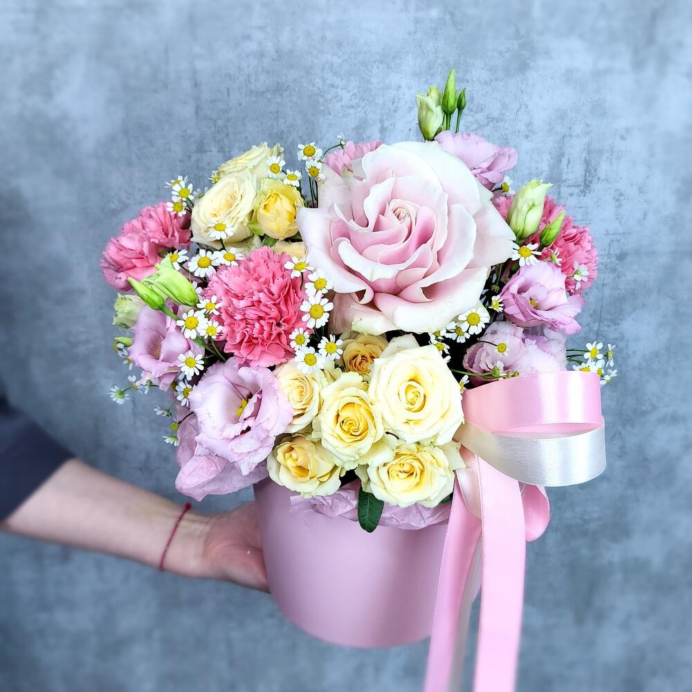 Роза Эквадор – 1 шт.Роза кустовая – 2 шт.Гвоздика – 3 шт.Лизиантус – 2 шт.Матрикария – 2 шт.Фисташка – 2 шт.Шляпная коробка – 1 шт.Оазис флористический – 1 шт.Лента атласная – 2 шт.
