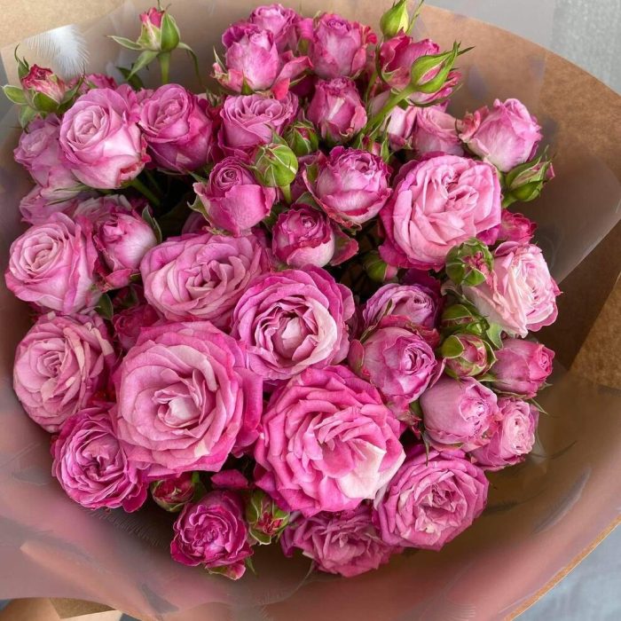 Упаковка дизайнерская – 2 шт. Открыточка с вашими пожеланиями – 1 шт. кустовые пионовидные розы – 9 шт.
