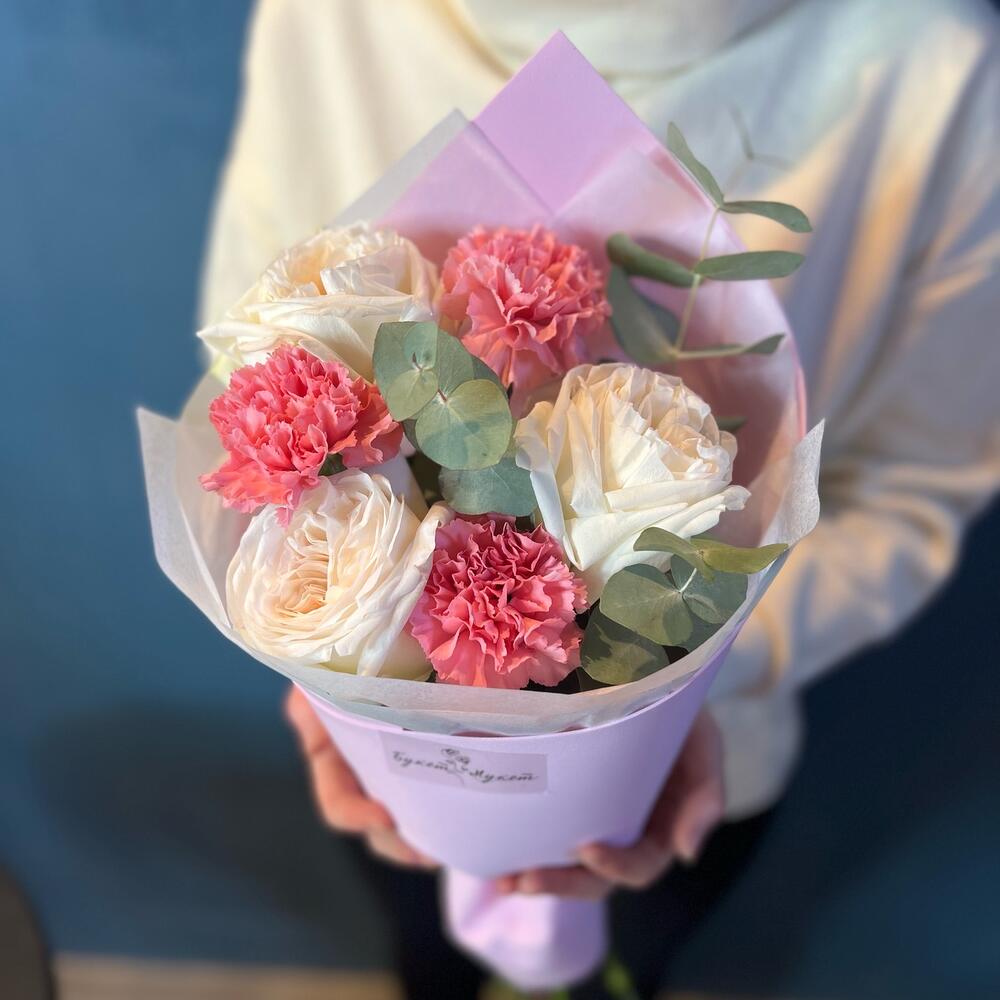 Эвкалипт – 1 шт.Тишью – 1 шт.Диантус – 3 шт.Фоамиран (упаковка) – 1 шт.роза white o’hara – 3 шт.