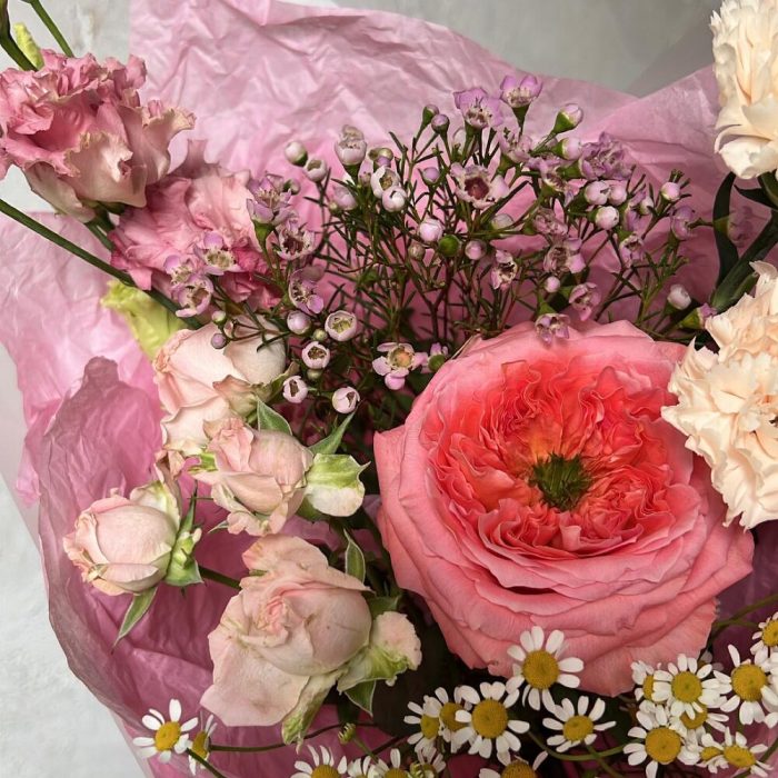 Пионовидная роза – 1 шт.Диантус – 2 шт.Кустовая роза – 1 шт.Ваксфлауэр – 2 шт.Эустома – 1 шт.Матрикария – 1 шт.Упаковка дизайнерская – 1 шт.