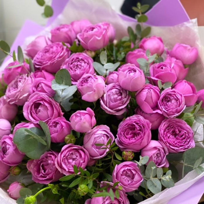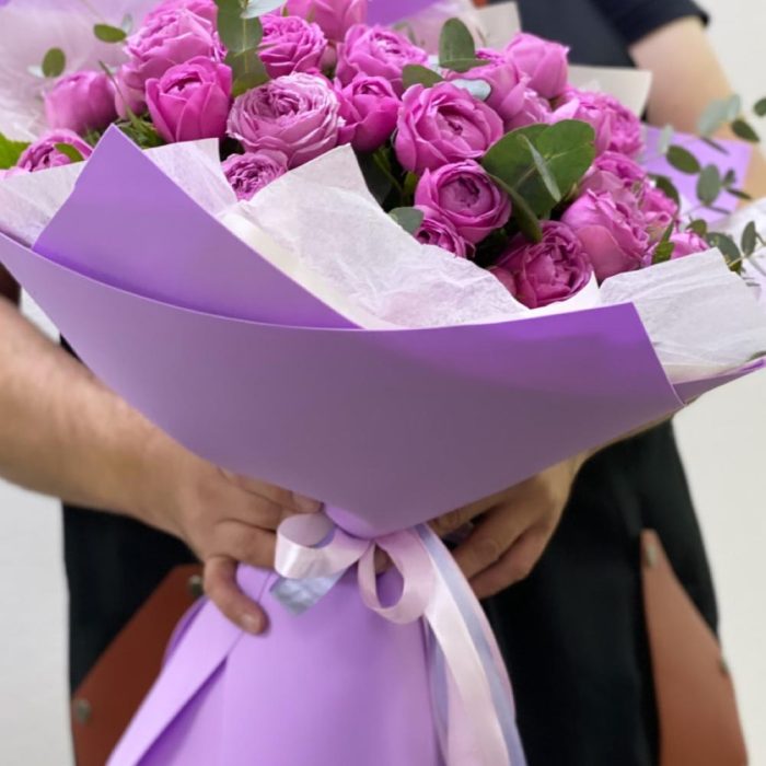 мистик баббл роза кустовая – 25 шт.зелень пучок – 2 шт.Упаковка дизайнерская – 5 шт.Лента атласная – 3 шт.