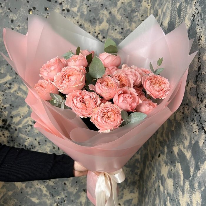 Эвкалипт – 3 шт.Лента атласная – 2 шт.Пленка матовая – 5 шт.роза пионовидная кустовая джульетта – 5 шт.